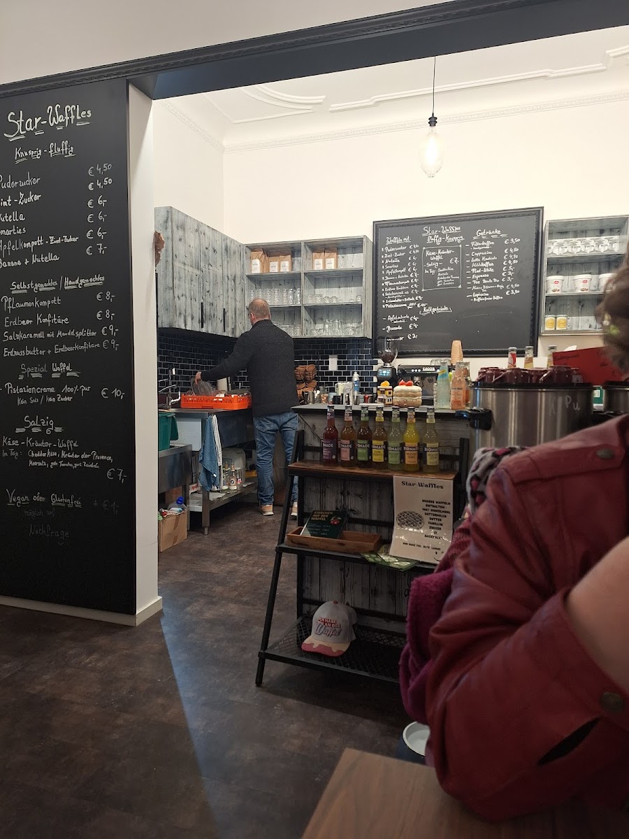 For cold drinks, the selection comprises hand-filtered coffee, tea, sparkling and still water, with prices between €2.00 and €3.50. These beverages can complement the waffles for breakfast, coffee breaks, or light meals throughout the day.